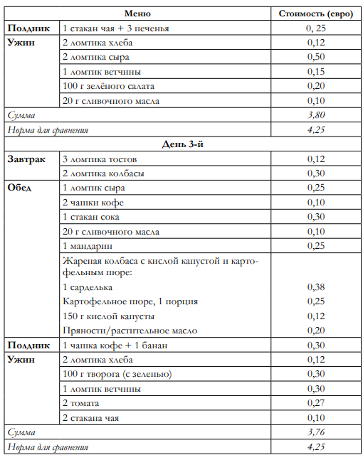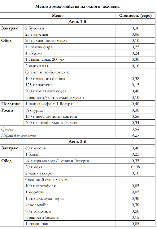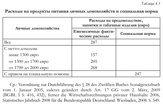 Немецкое личное домохозяйство имеет среднюю численность 2,08 человека, среди них детей моложе 15 лет — 0,29. Долевая норма в соответствии с предписаниями 2009 г. для расчётов выведена в табл. 4.3 из средней численности домохозяйства и средней доли детей. Из этого выходит, что домохозяйство, получающее основное обеспечение, социальную помощь или пособие по безработице II, может потратить в месяц 247 евро на продовольствие, напитки и табачные изделия, если оно ориентировано на нормальное потребление. Это 86% фактических расходов среднего немецкого домохозяйства. В фактических расходах среднего домохозяйства 40 евро отводится на табачные изделия и сопоставимые суммы (в приблизительной оценке) на потребление алкогольных напитков и безалкогольных прохладительных напитков (минеральная вода и т. п.) 16. В одних только этих двух позициях содержится потенциал экономии, который каждому живущему в домохозяйстве, зависимом от социальных выплат, даёт возможность питаться в точности так же, как питаются люди со средним заработком, а то и лучше.