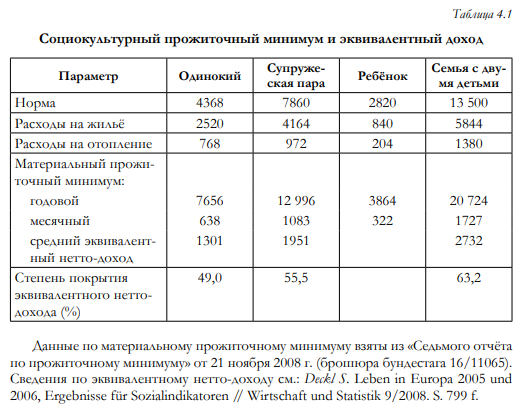 Всего в Германии около 10% населения живут либо полностью, либо в основном на средства основного обеспечения. В 2008 г. все расходы на основное обеспечение составляли 62,9 млрд евро, это 8,2% немецкого социального бюджета в 767 млрд евро и 21,6% финансируемых из налогов социальных выплат37, или 2,5% немецкого социального продукта38.