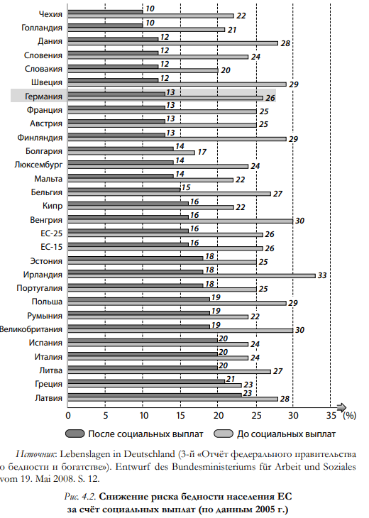 Рис. 4.2. Снижение риска бедности населения EC за счёт социальных выплат (по данным 2005 г.)